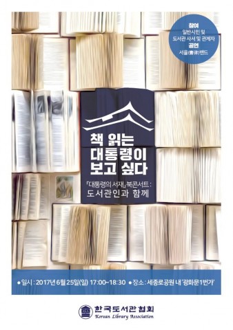 ▲ 대통령의 서재 북콘서트: 도서관인과 함께 홍보물한국도서관협회가 25일(일) 오후 5시부터 6시 30분까지 ‘책 읽는 대통령이 보고 싶다’를 주제로 ‘광화문1번가(종로구 세종대로 189)’에서 일반 시민 및 전국 도서관 사서, 관계자 등과 함께 ‘대통령의 서재 북 콘서트: 도서관인과 함께’를 개최한다.
