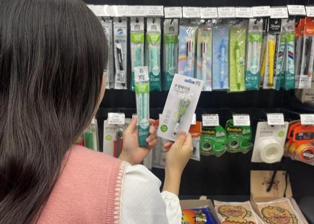 고객이 다가오는 대학수학능력시험을 앞두고 컴퓨터용 사인펜과 수정테이프를 살펴보고 있다