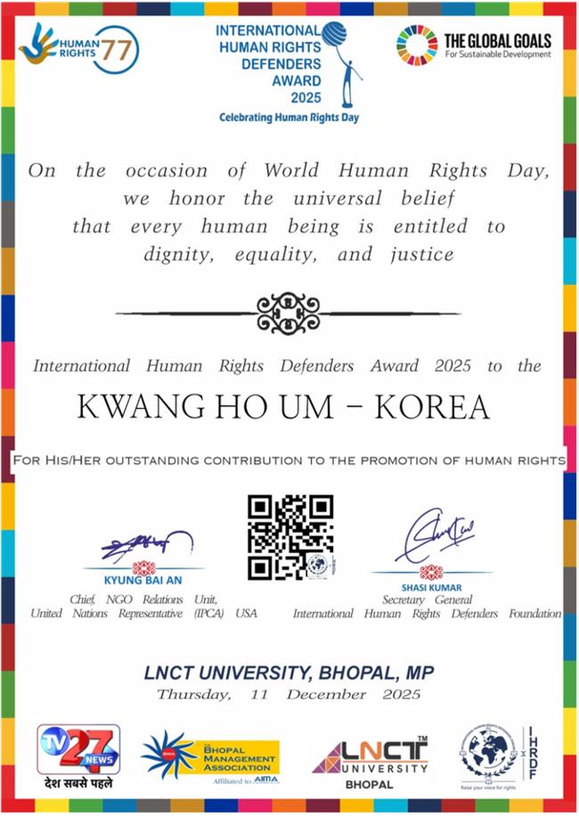 한국 대표로 국제 인권상(International Human Rights Defenders Award) 을 수상했다.