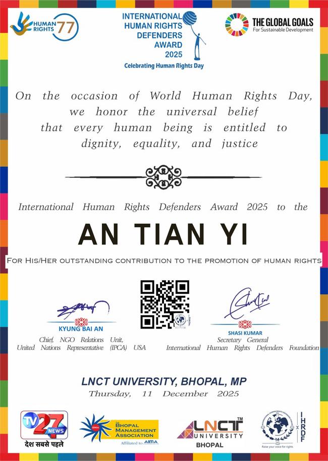 국제인권수호자재단(International Human Rights Defenders Foundation, IHRDF)은 2025년 12월 11일, 인도 보팔(Bhopal)에 위치한 LNCT University에서 열린 세계 인권의 날 기념 행사에서 길림성 승마협회 안천일(AN TIAN YI) 회장에게 International Human Rights Defenders Award 2025를 수여했다고 밝혔다.