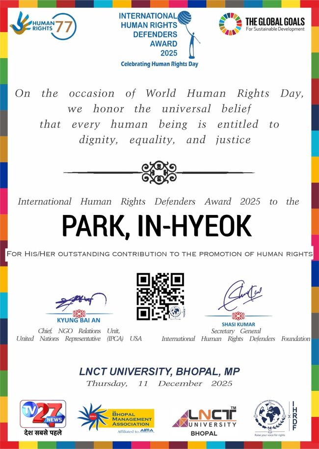국제인권수호자재단(International Human Rights Defenders Foundation, IHRDF)은 2025년 12월 11일, 인도 보팔(Bhopal)에 위치한 LNCT University에서 열린 세계 인권의 날 기념 행사에서 세계태권검도연맹 박인혁 부총재에게 International Human Rights Defenders Award 2025를 수여했다고 밝혔다.