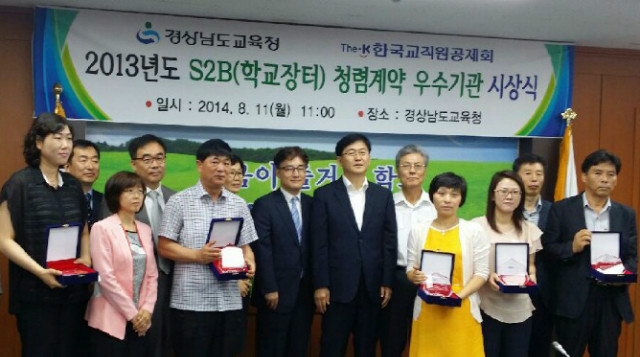 한국교직원공제회가 지난 11일, 경상남도교육청에서 S2B학교장터 청렴계약 우수기관으로 선정된 경남지역 교육기관에 대해 시상하고 있다.황상현 S2B사업운영부장은 “S2B는 교육기관 전용 전자조달 시스템으로 현재 전국 13,000개 기관이 이용하고 있고 매년 이용 기관수가 증가하고 있다”며 “이번 청렴계약 우수기관 시상을 계기로 더 많은 교육기관들이 S2B에 관심을 갖고 이용할 수 있는 계기가 될 것”이라고 말했다.